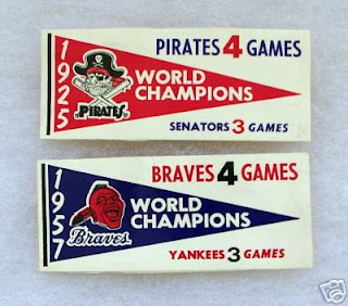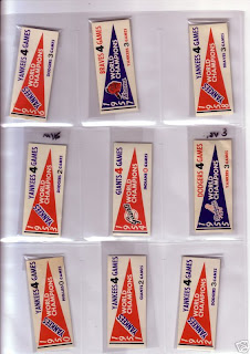 In addition, as the wrapper mentions, besides the decal, there was a sticker inserted as well. Fleer issued a set of pennant stickers highlighting the World Series from 1913 through 1960.
